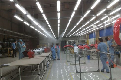 夏季阳光照射铁皮上,铁皮导热极快,高温时铁皮连续温度达60-70度以上,引起室内热岛效应,空气蒸发过快,温度居高不下,车间内的降温设备不能有效地发挥效果,根据现场实际环境采用在车间内加湿以及铁皮表面加湿的降温方法,是目前铁皮车间最快,最经济,最有效的降温方式。